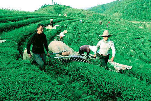 5月5日,江西省婺源縣大鄣山茶紫陽鎮(zhèn)考水茶葉基地的茶農(nóng)正忙著用機(jī)械采摘夏茶。眼下正值江西省婺源縣夏茶采摘的季節(jié),現(xiàn)代化的采茶機(jī)在茶園里忙碌地來回作業(yè)。婺源縣是“中國綠茶之鄉(xiāng)”,茶葉種植面積達(dá)16.8萬畝。婺源綠茶產(chǎn)品獲得6個AA級綠色食品認(rèn)證、11個有機(jī)食品認(rèn)證,5.2萬畝有機(jī)茶基地連續(xù)14年通過國際國內(nèi)檢測機(jī)構(gòu)檢測頒證,有機(jī)茶出口從開始的5噸到現(xiàn)在的3100噸,增長了620倍。國外市場從德國拓展到整個歐盟,并已開拓至美國、日本等國家。