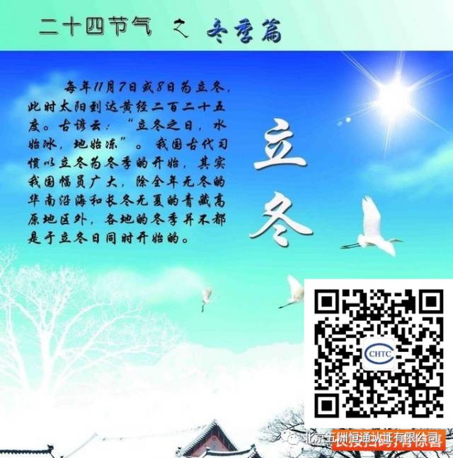 立冬,是24節(jié)氣的第19個節(jié)氣,意味著開始進入冬季。立冬過后,天明顯黑得更早,防寒保暖也顯得更加重要。古人在這個季節(jié)多用占卜的方法來看整個冬天的冷暖。古人認為,如果立冬當日是晴天,一個冬天都會寒冷;如果立冬當日是陰雨天,反而一個冬天都不是很冷,是暖冬。