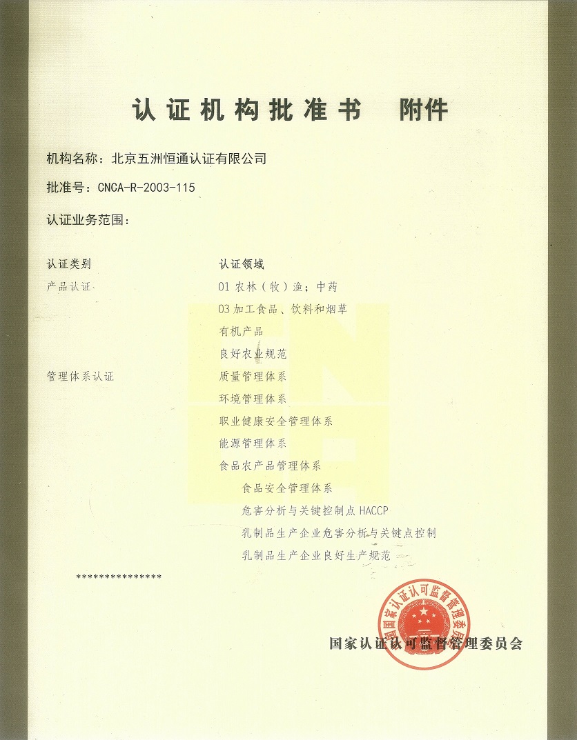 金雞歲末,捷報(bào)相傳,繼獲得良好農(nóng)業(yè)規(guī)范(GAP)、能源管理體系認(rèn)證資格之后,我機(jī)構(gòu)又獲得環(huán)境管理體系,職業(yè)健康安全管理體系認(rèn)證資格。至此,我機(jī)構(gòu)認(rèn)證業(yè)務(wù)范圍包括:有機(jī)產(chǎn)品、良好農(nóng)業(yè)規(guī)范(GAP)、質(zhì)量管理體系、能源管理體系、食品安全管理體系、危害分析與關(guān)鍵控制點(diǎn)(HACCP)體系、乳制品良好操作規(guī)范(GMP)、乳制品危害分析與關(guān)鍵控制點(diǎn)(HACCP)體系,環(huán)境管理體系,職業(yè)健康安全管理體系認(rèn)證。