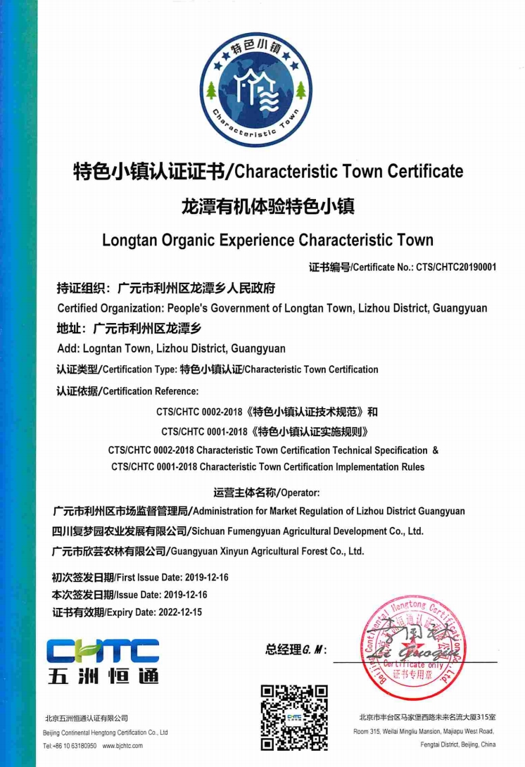 北京五洲恒通認(rèn)證有限公司(CHTC)依據(jù)《特色小鎮(zhèn)認(rèn)證實(shí)施規(guī)則》(CTS/CHTC 0001-2018)和《特色小鎮(zhèn)認(rèn)證技術(shù)規(guī)范》(CTS/CHTC 0002-2018)對廣元市利州區(qū)龍?zhí)多l(xiāng)人民政府關(guān)于“龍?zhí)队袡C(jī)體驗(yàn)特色小鎮(zhèn)”的認(rèn)證申請開展了評審工作,“龍?zhí)队袡C(jī)體驗(yàn)特色小鎮(zhèn)”符合相關(guān)要求。五洲恒通于2019年12月16日為獲證組織簽發(fā)特色小鎮(zhèn)認(rèn)證證書(證書編號:CTS/CHTC20190001)。特色小鎮(zhèn)認(rèn)證證書信息已在全國認(rèn)證認(rèn)可信息公共服務(wù)平臺(cx.cnca.cn)和北京五洲恒通認(rèn)證公司官方網(wǎng)站(qiandonga.cn)發(fā)布。