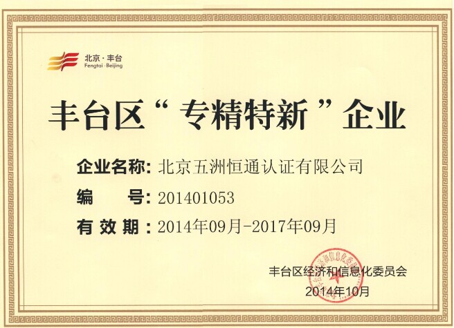 近日,北京五洲恒通認(rèn)證有限公司被北京市豐臺(tái)區(qū)經(jīng)濟(jì)與信息化委員會(huì)評(píng)為“專(zhuān)精特新”企業(yè),獲得“專(zhuān)精特新”企業(yè)資格證書(shū)。