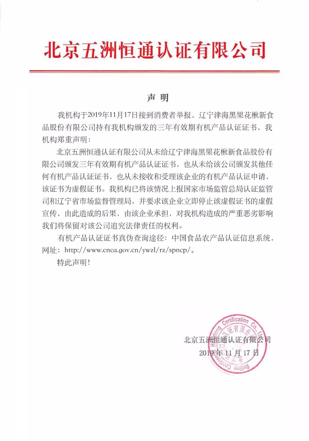 關(guān)于遼寧津海黑果花楸新食品股份有限公司虛假有機(jī)產(chǎn)品認(rèn)證證書的聲明